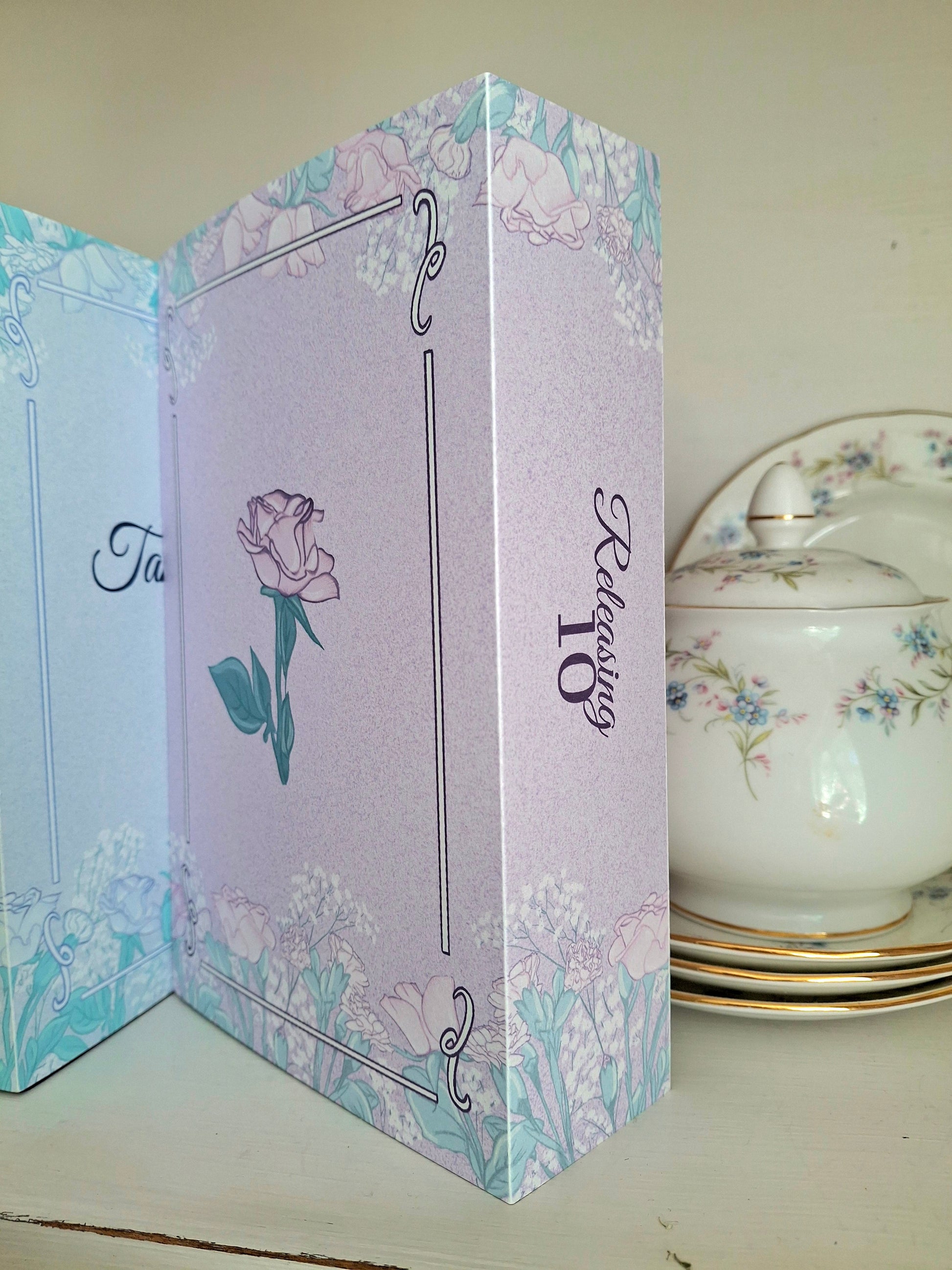 Each cover includes Title on the front and spine. Finished with an ornate flower on the back.
